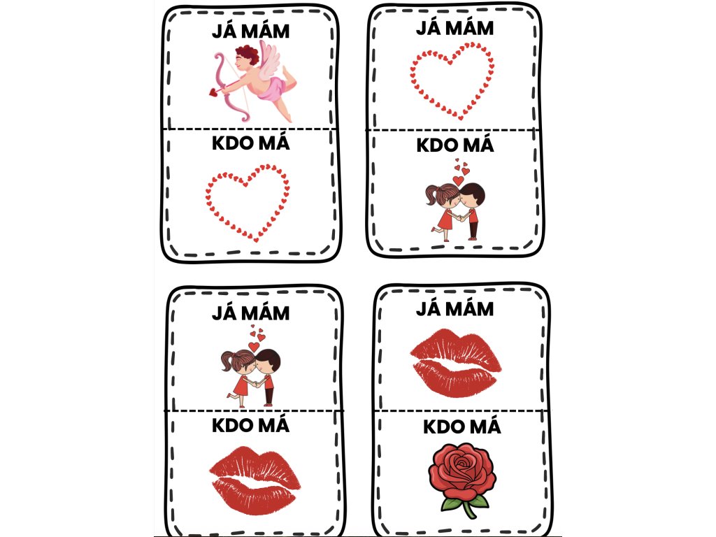 Cílem hry je propojit všechny kartičky do správného řetězce pomocí valentýnských obrázků.
