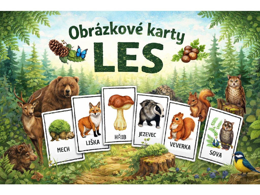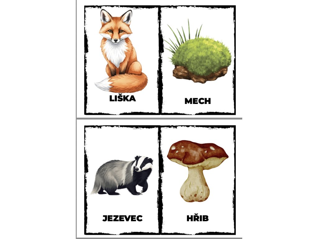 Sada obsahuje přehledné dvojice i samostatné pojmy z lesního prostředí, např.: